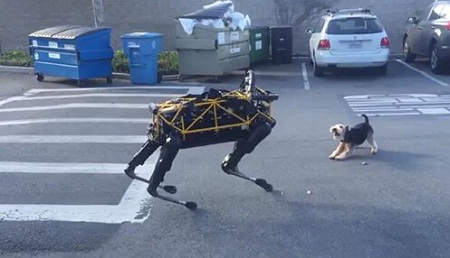 然而小狗貌似对于机器狗这个同类并不买帐,一发现它就冲上去狂吠,无论机器狗是与它正面相对,还是试图离开,小狗Alex都不依不饶。最后机器狗只能“服软”趴下。