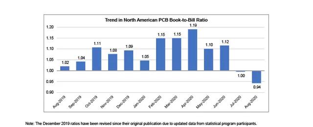 据PCB厂报道,2020年8月北美PCB的总发货量比去年同期下降了2.5%, 与上个月(7月份)相比,8月出货量下降了1.0%。