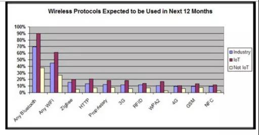 蓝牙5.0传输速度为2Mbps,是之前4.2 LE(低功耗)版本的两倍。并且早在3.0开始,蓝牙技术就已开始引入了HS高速传输,通过与802.11通信协议的整合,允许移动设备之间借道Wi-Fi通道实现24Mbps的传输速度。但由于HS技术受限于体积及功耗,仅适用于诸如蓝牙与Wi-Fi集成的功能模块,比如无线网卡之类的。在这一点上,在便携移动性上,蓝牙略胜于Wi-Fi;但在传输速率方面,不考虑集成功能模块,Wi-Fi则更胜一筹。 2、更强的解决信号干扰问题能力 虽然,蓝牙5.0依旧是运行在2.4GHz频率上,存在信号干扰的隐患;但实际上已经有了较大的提升,蓝牙SIG曾经就表示,相对Wi-Fi和LTE信号,新版蓝牙能在一定程度规避有限空间内的“信号堵塞”,比如同样工作在2.4GHz的Wi-Fi,这一点不分伯仲。 在传输距离上,蓝牙 5.0 会更胜一筹。未来的家庭物联网应用场景中,用户对数据流量需求大的设备(手机、电脑等)会使用 Wi-Fi ,而其余的智能家居设备,则会选择使用蓝牙。这一点上两者也是不分上下,各有优势。 3、传输距离更加宽广 蓝牙5.0具备了理论300米的有效信号通讯范围,是4.2 LE版的4倍。在传输距离上,Wi-Fi组网技术有着得天独厚的优势,但蓝牙技术目前的发展,已开启了物联网Mesh网状网络技术,它能使蓝牙5.0设备相互作为信号中继站,从而也能将信号传递到无限远。无线Mesh与传统组网方式不同,网络中的每一个节点都是移动的,任意的两点都以动态的方式保持联系,最终形成一个可以不断扩展的网络架构。 4、支持更小的体积、更低的功耗 在相当多的物联网设备中,比如说传感器、可穿戴设备,其最大的限制因素之一就是体积的大小,因为其自身电池容量非常小,反复充电也很不方便。蓝牙从4.0开始相比上一代,功耗更低、主要面向对功耗需要极低、用纽扣电池供电的应用。目前,大部分的可穿戴设备都是实用蓝牙低功耗技术(BLE)。越是小型的物联网设备,蓝牙BLE的应用越是受到青睐。 除此以外,蓝牙5.0针对物联网进行了很多底层的优化,锁定了智能家居、音讯和物联网很多的重要规范;强化了导航功能,可以结合Wi-Fi实现精准的小于1米的室内定位;在数据传递容量提升面更是达到8倍,能够创建像Beacon这样更加复杂的连接系统... 综上可以看出,蓝牙5.0技术规格主攻物联网及智能家居的规范,相较WiFi传输,蓝牙传输的优点是成省电、安全性高、兼容性高、有效距离更远、成本低,但目前,唯一缺点就是网速较慢。 但从针对物联网、智能家电、可穿戴设备等所指定的技术规范,相比Wi-Fi等其他无线技术属于领跑。在企业级应用中,市场上大多采用的无线组网方案,在可预见的期间,蓝牙也会继续抢占先机,也更适合物联网的发展特性。 上图表示开发者对采用无线协议的预期,红色表示物联网 目前,伴随蓝牙5.0的协议标准的推出,蓝牙的通信能力、通信标准做了非常大的改变,特别是Mesh组网功能,对物联网照明等应用将带来巨大改变,是目前物联网协议的热点,是非常值得电路板工程师们涉猎的领域。 PCB厂为帮助大家建立对蓝牙技术的概念,并熟悉蓝牙协议栈的应用开发环境,掌握蓝牙5.0技术发展动态。本着一次做好一件事情的原则,7月13日晚上8点,我将做客电子发烧友直播间,打开大家对于学习蓝牙的兴趣点,通过蓝牙技术,将大家带入物联网的世界。