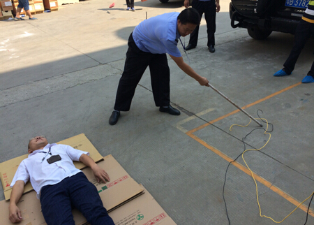 别急咱来“解救”你,警卫大哥用木棍迅速拨开电线,注意是木棍,塑料的也行,关键是不导电,重要的事情说三遍,不导电!不导电!不导电!