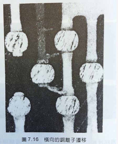 如果同一层导体层内产生铜离子迁移时有可能的原因是树脂特性以外的因素所造成的结果,例如图7.16为去除晶片的线路板接合部分表面,由照片可以看到中间的三条线路间有产生铜离子迁移的现象,这些导线之间的最小线距为65um,因此铜离子迁移的现象不只发生在距离只有40um的相邻导线层间也会发生在线距65um的相邻导线之间。