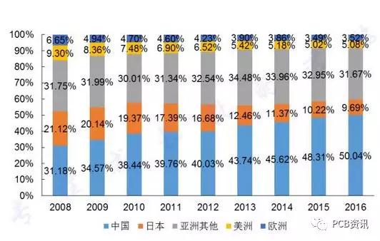 国外的PCB产业逐渐往中国转移,中国的PCB板行业逐渐成长起来,占全球总产值的比重越来越高。