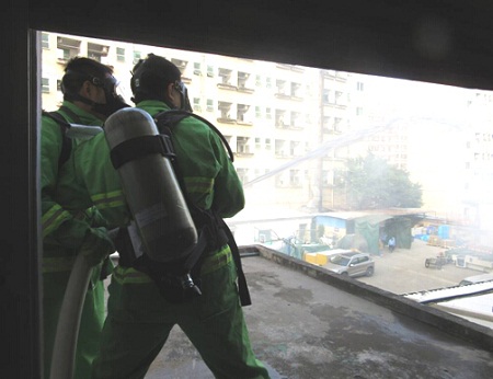 应急队伍迅速的的赶到火场使用灭火器和消防栓进行灭火