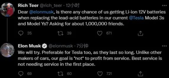在问到特斯拉CEO马斯克能否在旗下车型中加入锂离子电池等续航能力更佳的可替换电池,马斯克则表示正在考虑。此外,他还强调了特斯拉的目标是 " 服务免费 ",似乎表达了为用户尽心提升体验升级的意思。