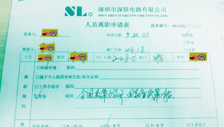 2015悄然过去,那些“看世界”、“回家炒股”、“天太冷,起不来”、“雾霾太大,找不到公司的路”之类的,都已经辞职了,还有多少颗想要辞职的心在蠢蠢欲动?虽然,深联电路板厂员工辞职的不多,员工的流失率不足3.5%,但也不乏一些屌炸天又不得不批的辞职理由,比如这样的…