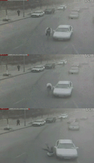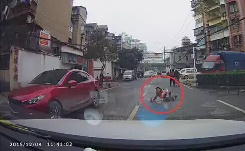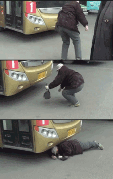 这位大妈更谨慎了,离车六七米就趴下了,车主速度不超过20码,大妈见状便走到车跟前又慢动作回放一般“优雅”地趴下了,敬业的精神堪比寻常…