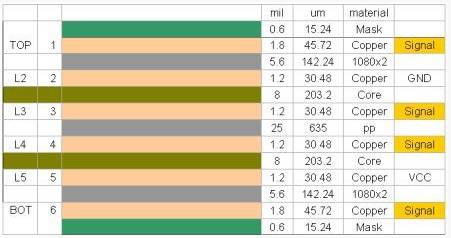 当制作某一特定厚度的印制板时,一方面要求合理地选择各种材料的参数,另一方面,半固化片最终成型厚度也会比初始厚度小一些。下面是一个典型的6层板叠层结构: