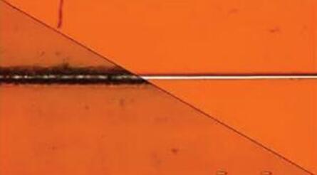 图1:CO2激光(左)与UV激光(右)的切割槽比较。UV激光产生热效应较小,其切割边沿干净、整齐
