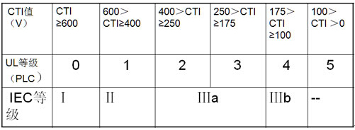 相比漏电起痕指数Comparative Tracking Index (CTI):材料表面能经受住50滴电解液(0.1%氯化铵水溶液)而没有形成漏电痕迹的最高电压值,单位为V。