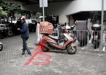 最重要的是投影的图案可定制,这就为这款产品提供了无限的可能,像下图中那个麦当劳的大LOGO就是个例子。这就无形中为商家们打开了一个全新的宣传渠道,尤其是对那些自带物流的商家来说。这种宣传方式将大大减少纸张的浪费,并且对于商家来说综合成本也更为低廉。