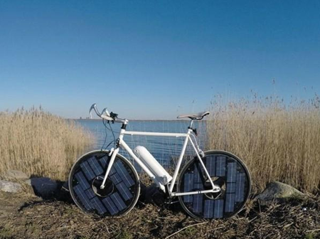 Solarbike外形不同于市面上大多数电动车而一般人力自行车很像,事实上其电池只占了很小的体积。没错,图片上那个通常放置自行车水壶的地方安装的就是新型的瓶状电池。当Solarbike静止的时候,轮毂两侧的太阳能电池会通过太阳能进行充电,根据光照时间和强度,一天大概能给Solarbike充2-25公里的续航里程;前进时,马达的动力由太阳能电池和那个体积稍大的瓶状电池共同提供。
