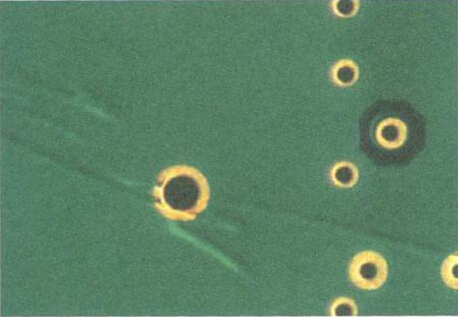 另外,胶片(PP)组合方式和热压参数也非常重要。如果胶片叠合移动或产生流胶不当,铜皮飘移在融熔树脂表而必然会产生绉折。要防止这类问题发生,压板用的载盘就是作业重点。目前业者使用的载盘设计,多数都已经采用弹性高度调控的挡滑设计,这种设计可以在压板过程中完整防止钢板偏滑,因而导致的绉折就不会发生。