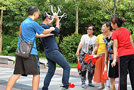 小伙发现遭到“劫机”事件,赶紧跑来找大妈们赔偿,却不料大妈不仅否认击落了无人机,更表示自己险些被无人机砸伤。小伙欲哭无泪:“为了给女朋友制造惊喜,特意买的月饼券竟然全被大妈们抢走了,真是赔了夫人又折兵!”周围也有不少围观群众前来劝解:“90后遇上彪悍大妈,果然是秀才遇到兵,有理说不清!”