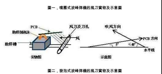 一,波峰焊机未装风刀,或者风刀角度不对以及风刀孔堵塞、气压不够风力太弱不能正常工作等,因此造成PCB助焊剂涂布量太大。在波峰焊机中,无论是喷雾式还是发泡式波峰焊机,在PCB助焊剂涂布完后,都要经过风刀吹风。参考下图一、图二,分别是喷雾式波峰焊机及发泡式波峰焊机的风刀效果图。