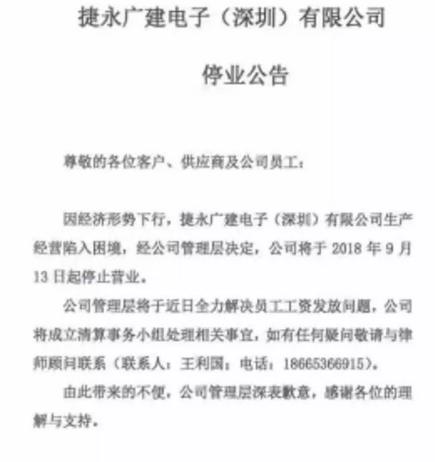 9月15日早晨,有粉丝爆料称,又一家千人工厂捷永广建电子(深圳)发布停业公告。