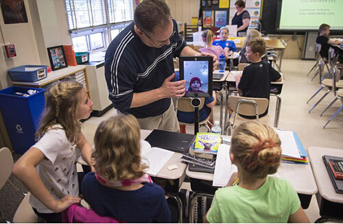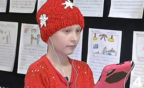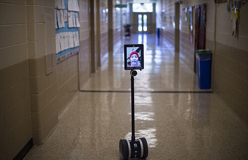 先来看看这位9岁小女孩佩顿是如何“重返校园”的。这个的机器人是一个固定在滚动平衡车上的iPad屏幕,佩顿称它为酷炫的虚拟分身(Peyton's Awesome Virtual Self)。佩顿通过另外一个iPad上的应用软件对其进行远程操控。机器人代替佩顿,行走在校园中,和同学们聊天,和小伙伴们一起上课。