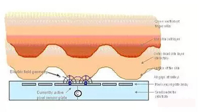 电容式指纹采集视图,通过对皮肤和屏幕的接触,识别指纹的纹路来记录和验证指纹。