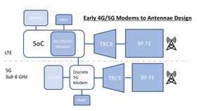 图2 采用分立式5G调制解调器和射频前端的第一代5G设计