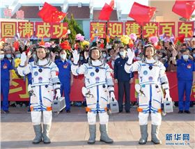 6月17日,神舟十二号航天员出征仪式在酒泉卫星发射中心举行。这是航天员聂海胜(右)、刘伯明(中)和汤洪波在出征仪式上挥手。