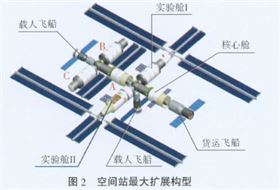 根据中国空间站工程的总体构想,空间站包含天和核心舱、“问天”实验舱 I 和“梦天”实验舱 II 三个主要部分,三者通过交会对接和舱体转位组装构成空间站基本构型。其中,核心舱前端设置节点舱,用于完成载人飞船的对接和停靠;核心舱后端还有一个对接口,用于货运飞船的对接和停靠。分设两翼的两个实验舱则通过节点舱与核心舱相连,配有用于科学实验的密封舱,还可以用来存放消耗品和补给货物、备份核心舱部分平台功能、安置多功能巡天光学设施等。