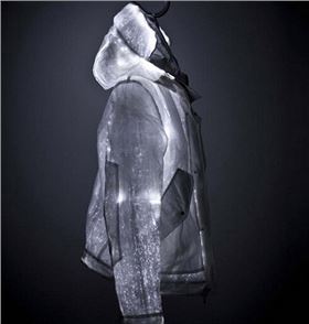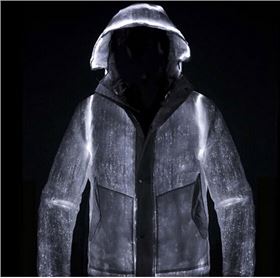 由图我们可以看到这种“夜光”外套上面布满了微型LED发光二极管,外层是一层透明的布料,增加LED的透光性,营造出极具未来感和科技感的视觉效果。内衬则采用了一种特殊的铝涂层,具有良好的绝缘性,可反射身体热量以最大程度抵御冬季里的冷空气和寒风,提供比较持久的保暖效果。