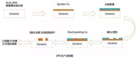 在薄膜工艺中,基于薄膜电路工艺,通过磁控溅射实现陶瓷表面金属化,通过电镀实现铜层和金成的厚度大于10微米以上。即DPC( Direct Plate Copper-直接镀铜基板)。