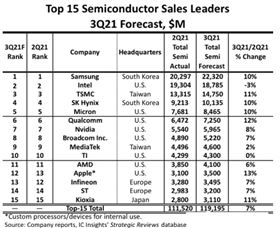总体而言,前 15 家公司预计将在 21 年第三季度实现 7% 的增长。半导体销售预计到年底仍将保持强劲,这支持 IC Insights 目前对今年全球半导体销售增长 24% 的预测。
