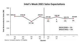 据汽车电路板厂了解,一些领先的公司——尤其是英特尔和德州仪器——预计 21 年第三季度的销售额不会出现如此乐观的增长。TI 指导 21 年第三季度销售业绩持平。英特尔现在是全球第二大半导体供应商,在其最近的收益报告中将其 21 年第三季度的销售指导定为 -3%,并将全年销售指导定为 -1%(图 2)。在预计半导体总销售额将增长 24% 的一年中,这对于这家处理器巨头来说将是一个特别疲软的表现。此外,英特尔的 2H21/1H21 销售预期也下降 1%。目前预计英特尔 2021 年第 4 季度的销售额将比其 20 年第 1 季度的销售额低 3%,从而导致两年期间业绩基本持平。