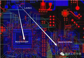 1.2V和1.8V是内核电源(如果直接采用线连的方式会在面临BGA器件时遇到很大困难),布局时尽量将1.2V与1.8V分开,并让1.2V或1.8V内相连的元件布局在紧凑的区域,使用铜皮的方式连接,如下图:
