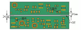 ②对于需要机器自动分板的线路板,V-CUT线两面(TOP和BOTTOM面)要求各保留不小于1mm的元器件禁布区,以避免在自动分板时损坏元器件。如下图。(元器件与V-CUT跟5.3.7冲突)