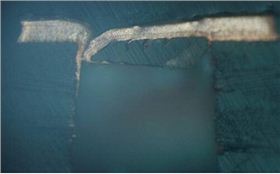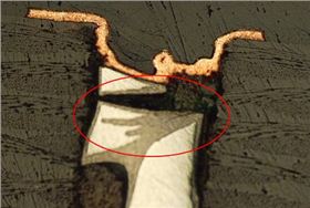 孔未钻穿造成的孔无铜,切片特征:孔口有底铜未钻穿